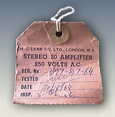 Shown the the right is a final inspection tag fitted at the factory to a Leak Stereo 20 amplifier, dated 20 Oct 1964. At this time, the Stereo 20 was being shipped in dark metallic grey livery with cream lettering .