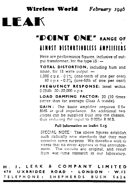 The exact products the company produced between 1934 and 1946 are not known. Although it seems likely that Leak may have continued to build amplifiers for Gaumont British Cinemas (a Gaumont amplifier installed some time after the War in the Dendy Theatre, Brighton, Australia, had a circuit basically the same as that used in the Point-One range of amplifiers produced by Leak). A review of advertisments in the technical press from 1934 onwards, shows that one of the first post-war advertisements was placed in "Wireless World" in February 1946. It is also reported that Leak placed an advertisement for a 13 Watt P.A. amplifier in Wireless World during1938 (although a search so far has failed to locate it.)