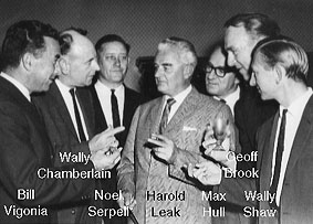 This photo was taken in Australia, probably during the early 1960's. Judging by the excited expressions on everyones faces, maybe the photo was taken around the time of the release of the first transistorised amplifiers by Leak. Any information about the photo would be of interest, as addtional details could be included here. The people in the photo from left to right include some well known names from the broadcasting industry: