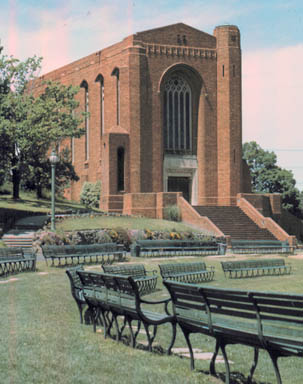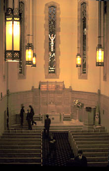 As a child travelling to the city on the train, my mother pointed the chapel out and said that she had been married there. In 1991 I was married there too. At school, we only visited the chapel for House or Form Chapel Chapel (as far as I recall). I liked the organ in the Chapel as it seemed to render my lower notes than the organ in the Memorial Hall. I liked low notes. Although the Chapel organ was not a very loud organ. Right: The Littlejohn Chapel from Monash Drive in 1975, showing the older-style seating around the Main Oval. The path to the left of the chapel was the way home, as well as the way to arrive at the school from Glenferrie Road. Below: Interior of the chapel in 1975. |