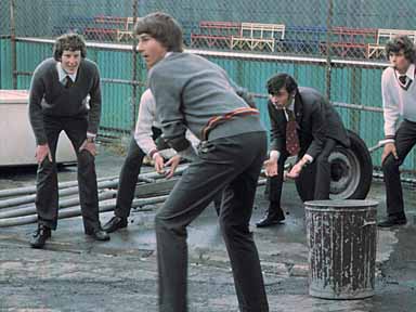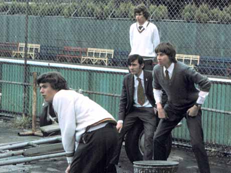 I often had classes in Room 19, adjacent to the Tuck Shop, and suffered the tantalising smell of Four-and-Twenty meat pies as they heated up on a cold winters day. For some strange reason, the Tuck Shop sold the best coffee scrolls I have ever had. Flavoured milk was a favourite, but this was before "Big-M" was marketed, so to buy flavoured milk, you were given a carton of plain milk, you then drank a small portion first, and then the flavouring was poured in. For some, lunchtimes meant improvising some form of sport. For me I wasn't interested in this, but some of my mates were. The photos at the right were taken next to the old pool, just south of the old science block. The Meares Oval is directly behind in these photos. Top: Greg Holland-King, Rob Thompson (seated), Anders McDonald, and Andrew Wynn. Bottom: Stephen Kerr, Andrew Wynn, Rob Thompson, and Anders McDonald. All photos 1975. |