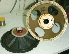 Remove the old cone by: undo all the scews at the back of the outside rim and remove the gasket, and the gasket metal rings that clamp the outside of the surround into position. Unsolder the low frequency voice coil leads, and then undo the for small nuts that clamp the spider into position. The cone should now be removed from the chassis. Immediatley seal the magnetic gap to prevent ingress of foreign matter into the gap Adhesive tape can do this job.