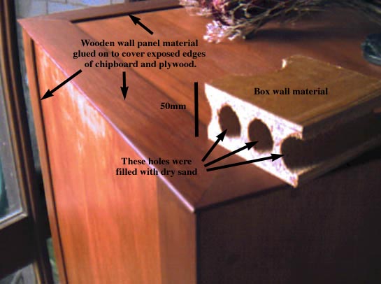 Minimising Box Colourations Although a rectangular box is simple compared withhorns there are still some important considerations. A major issue is minimisingbox colouration. I made the panels from some scavenged office partitionmaterial consisting of a chipboard core faced with plywood on both sides.Overall the material is 50mm thick, thicker than most speaker box material.It had 25mm holes running vertically through the core, presumably to reduceweight, which I filled with sand. The holes were plugged with bits of oldmattress foam and then sealed with automotive "bog". In additionto thick panels and sand-damping, I placed two shelves inside the boxesfor bracing. These have cut-out areas to allow air movement but the remainingwood ties opposite panels to each other, braces along the face of each paneland triangulates across the corners. Consider that even slight panel vibrationis distributed over a much larger area than the speaker cone and could contributesignificant sound output. I doubt it would be possible to go to far tryingto kill panel vibrations.  When making these plans I received the interestingcomment that the old Tannoy drivers can produce a very modern sound withsuch construction but that some people have been disappointed if part ofwhat they liked about the older Tannoys was the warmth of box colourations.Personally I doubt that anyone would prefer the tubby sound of the Lancastersover the improved clarity, dynamics and extension of my big boxes. The dimensions of the box were made as narrow aspossible side to side without boxing in the driver very closely, mainlyfor visual aesthetics. I then tried to avoid making the height or depthof the box simple multiples of this internal width. This was to avoid multipleinternal standing waves that might reinforce each other. The box ended upbeing 57cm (w) x 63cm (d) x 134cm (h) external dimensions. Inside the boxthe bracing shelves are just a little above and below the driver. The intentionwas to put most bracing where the driver might try to move the panels mostbut also avoid any very large unbraced sections. The bracing was also placedso that the sections of panel between the bracing were of different lengthsto spread the frequencies of any residual resonances. Damping material for the space inside the box seemsto be a bit of a black art. In a vented box its function is to absorb higherfrequency radiation from the rear of the cone that might otherwise bouncearound and excape through the cone or vents. Also it should damp lower frequenciesthat might set up standing waves within the box. I applied a little readingand a little thought to this area. I am happy enough with the initial resultsthat I havn't tried any experiments in this area. Ideas I used were 1) Woolis supposedly a better damping material than polyester, glass fibre etc.2) Air particle motion is always at a minimum at the box wall, thereforedamping material placed on the wall has least effect. 3) A clear thoughnot straight path must be available between the driver and the vents andthe vents should be well clear of damping material and the box walls. I was able to buy batts of pure wool intended forceiling insulation. Two of these went in the box supported by the shelfabove the driver and so the top quarter of the box is full of loose wool.This should make it hard to sustain standing waves along the long (top tobottom) axis of the box. Another batt was stapled to hang loosely aroundthree sides of the middle section of the box behind the driver. A fourthbatt is in a U shape in the bottom section of the box. The four ports areon the front baffle in the lower section of the box. Immediately behindthe port opening is a large acoustic foam tile, the sort with wedge patternson the surface. Measurements of the port output indicated virtually no higherfrequencies escaping the port. More subjectively, when I had my head andshoulders through the driver hole, hammering the staples holding the woolin place the metal on metal sounded like dull thuds. Moving the drivers into these well damped and bracedlarger boxes gave extra octaves of bass and a big improvement in the tightnessand clarity of the bass and mid-range. Moving the Beasts