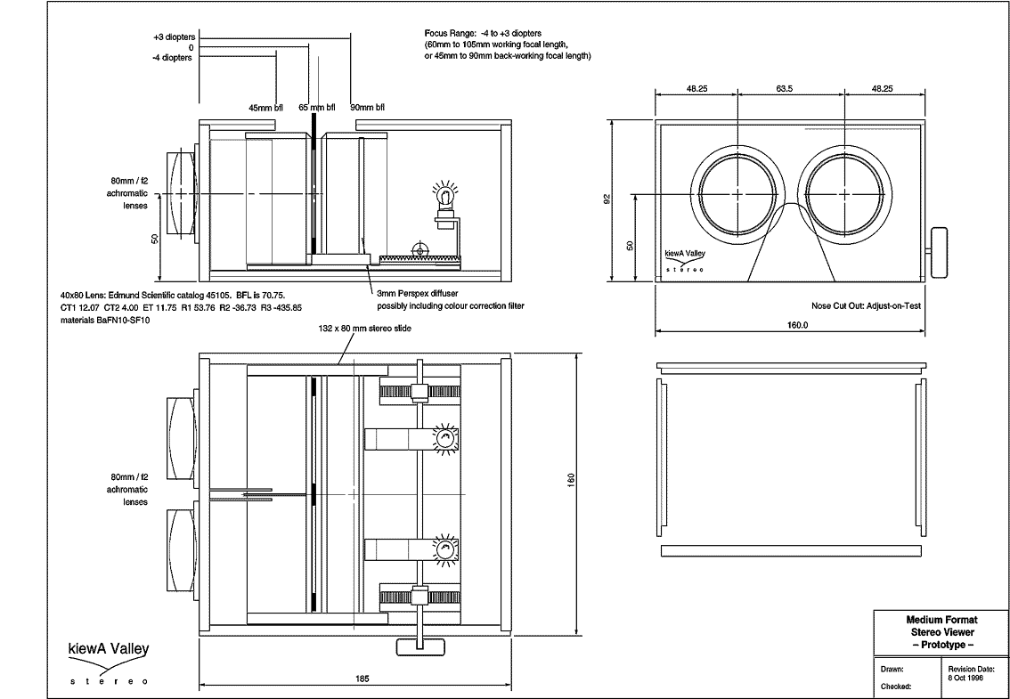 The design of the viewer started with the choice of a suitable lens, which should be an achromatic design so that colour fringing effects in the image will be minimised (generally this means that the lens will be a cemented doublet, although air spaced doublets are also possible). The focal length required for the lens should be close to the focal length of the camera. For medium format, the camera and viewer lenses will be in the range of 75mm to 85mm focal length. In choosing the lens, it was always in mind that a lens with a sufficiently large enough diameter would mean that inter-ocular adjustments would be come unnecessary (see later). Another desirable feature is to use lenses that have anti-reflection coatings on the lens surfaces, thus increasing the contrast in the image.