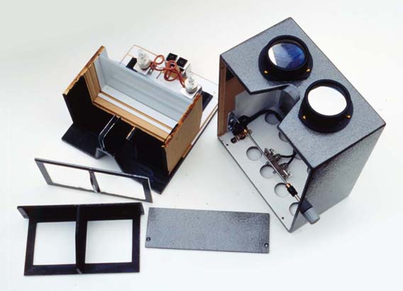 The illumination system uses two 12 Volt / 10 Watt halogen bulbs, spaced 72mm apart - not 62mm which is the aperture separation. (The photos show two 6Volt / 10 Watt lamps running in series, however it was later changed to the 12V /10 Watts running in parallel). The increased separation gives a slightly more even coverage of the diffuser illumination, as the area of the diffuser between the lamps is lit by the output from both lamps, where as the area of the diffuser towards the outside of the viewer is predominantly lit by the closest lamp.
