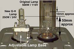 The new lamps require a "2-pin" socket with 6.35mm spacing. This is a standard pin spacing, and no difficulty will be encountered locating such sockets. However it may be difficult to find sockets rated for use with 250W lamps. In this particular modification some lamp sockets were salvaged from old mono projectors.