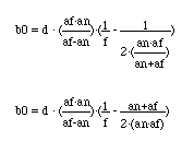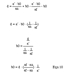 Equation 10 enables you to calculate the camera base provided you know the necessary variables - and these are: (af) the far point distance , (an) the near point distance, (d) the on-film deviation limit and (a') the distance from the lens center to the film plane. Of these variables, the first two are determined by the picture composition, the deviation limit is usually taken to be 1.2mm maximum for the 35mm film format, and the last one is not known unless it is calculated from the camera focus setting (a). The equation that can be used to calculate (a) is the "lens equation":
