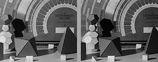 To test the truth of the General Solution using a practical example, a stereo pair was taken with a near point distance of 1.8 m, a far point distance of 2.2 m, a separation of 0.2 m, lenses of .05 m, and focussed on 2m. Although this is a contrived situation, it was chosen because under these condition the General Solution is predicting a camera lens base about three times more than the other methods (eg: the 1-in-30 rule would allow 60mm base, not 200mm). The result is perfectly viewable (Fig 3) though no equation other than the General Solution would have predicted this.