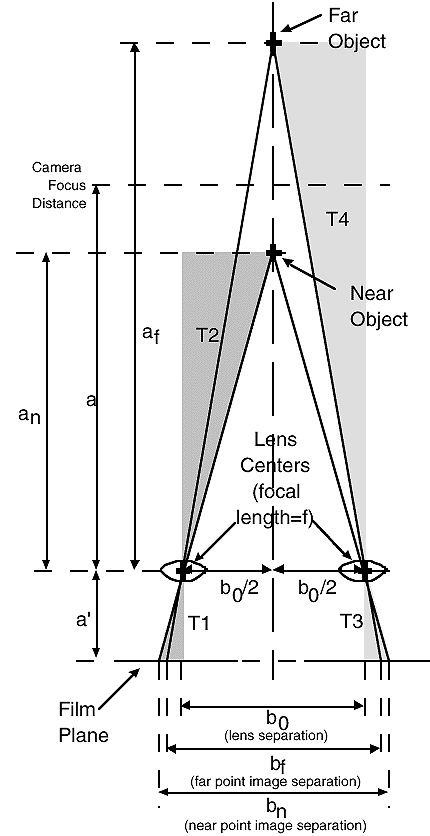Equation 7 gives the distance between the left and right near-point images on the film. For similar triangles T4 and T3: