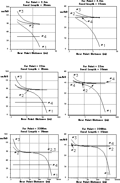 In discussing the results, the curve of Special Case No. 1 (labelled as #1 in each graph) is taken as the reference against which the others are evaluated. This is because it is the most accurate for practical use - the least number of assumptions are made, and the depth of field is maximised.