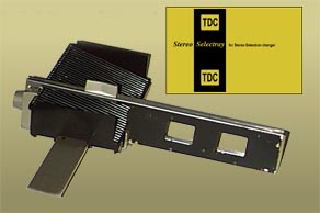 The main design problem concerns the way in which the projector light is "dowsed" while changing a slide. For ease of viewing it is important that the left and right images are dowsed evenly. In the original Selectron this is done with a shutter mechanism that has separate metal curtains for the left and right apertures. In a wide format stereo mount however there is insufficient space between the left and right apertures for a shutter blade large enough to cover the left aperture. I've come up with a double-plate sliding telescoping design that works very well.