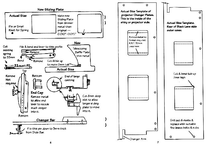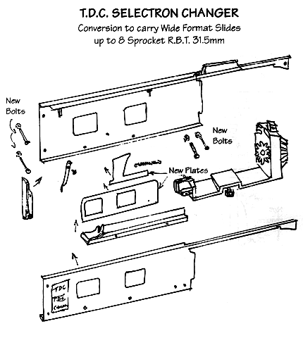 The conversion needs some sheet metal thinner than the original sliding shutter blade because there will be two blades in the same groove (0.0012" to 0.0015" will do), and five brass bolts and nuts 15mm long and 2mm diameter to replace the rivets drilled out when dismantling the changer. Tools required are: drills, files, tinsnips, vice, and a lot of patience, skill, and good luck.